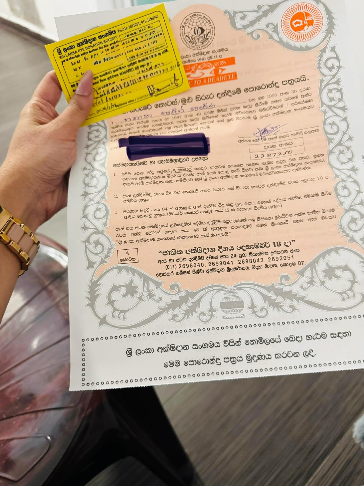 " ජීවිතේ සමරපු හොඳම Birthday එක.. කාලයක් තිස්සේ තිබ්බ ලොකුම ආසාවක් ඉටු උන දවසක් අද.. උදෙන්ම කොළඹ අක්ශිදාන සංගමයට ගිහින් මගේ ඇස් ඇතුළුව ශරීරයේ සියලු කොටස් දන්දෙන බවට සහතික උනා.. මම මේ ජීවිතෙන් සමුගත්ත දවසට තව එක ජීවිතයක් හරි ජීවත් කරවන්න ලැබෙන එක වචනෙන් කියන්න බැරි හැඟීමක්. සතුට කියන දේ විවිධ දේවල් වලින් ලඟා කරගන්න පුළුවන් උනාට, සැනසීම ලඟා කරගන්න පුළුවන් අවබෝධයෙන් පමණයි. මේ සහතිකය සිරුර දන්දුන්න බවට ලැබුනු පොරොන්දු පත්රයක් උනාට ඇත්තටම, මේක තමයි මගේ ජීවිතයට ලැබුණු වටිනාම සැනසීම... "